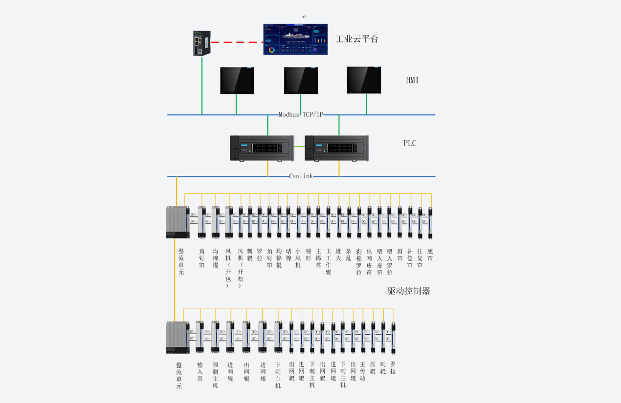 針刺線系統(tǒng)解決方案采用H3U+MD810的方案,采用CAN總線來(lái)連接。系統(tǒng)整體解決方案提高現(xiàn)場(chǎng)的設(shè)備的穩(wěn)定性,抗干擾性更強(qiáng)。同時(shí),采用共直流母線的電氣設(shè)計(jì)方案,實(shí)現(xiàn)梳理機(jī)的不斷網(wǎng),一鍵啟動(dòng)等功能。兼容遠(yuǎn)程物聯(lián)網(wǎng)功能,實(shí)現(xiàn)遠(yuǎn)程的設(shè)備調(diào)試,降低了設(shè)備的調(diào)試周期,提升維護(hù)性。