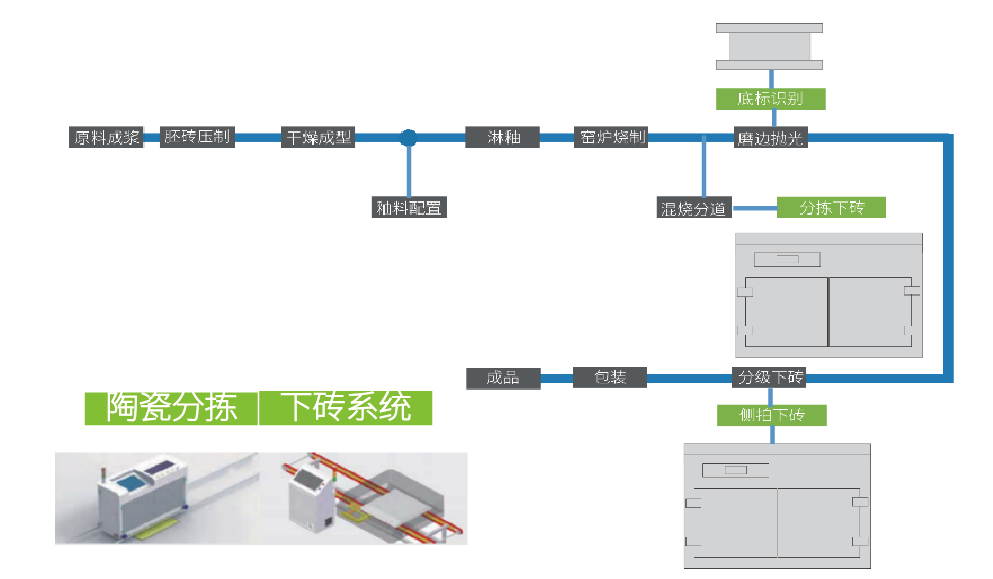應(yīng)對勞動力成本攀升和自動化升級的需要,針對陶瓷行業(yè)多種瓷磚混燒和不同品質(zhì)瓷磚分揀的情況,開發(fā)了窯尾陶瓷分揀系統(tǒng)。該系統(tǒng)支持至少5類不同尺寸、紋理和顏檢瓷磚同時分揀的需求,作業(yè)設(shè)置便捷、參數(shù)調(diào)節(jié)簡單,大量的應(yīng)用于各大知名陶瓷生產(chǎn)企業(yè)。